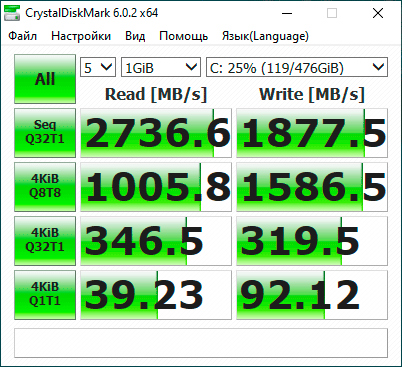 Производительности центрального процессора ноутбука достаточно, чтобы обеспечивать максимальную скорость этого SSD даже при работе от аккумулятора. В последнем случае тестовые показатели накопителя не снижались, как это бывает у более «приземленных» моделей ноутбуков. Вот какие результаты мы получили.