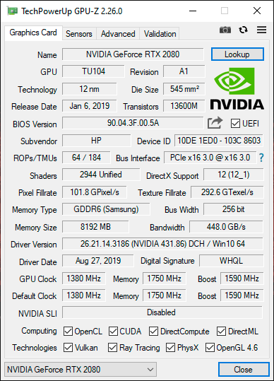 | Видеоподсистема | Nvidia GeForce RTX 2080 (GDDR6, 8 ГБ/256 бит) | |