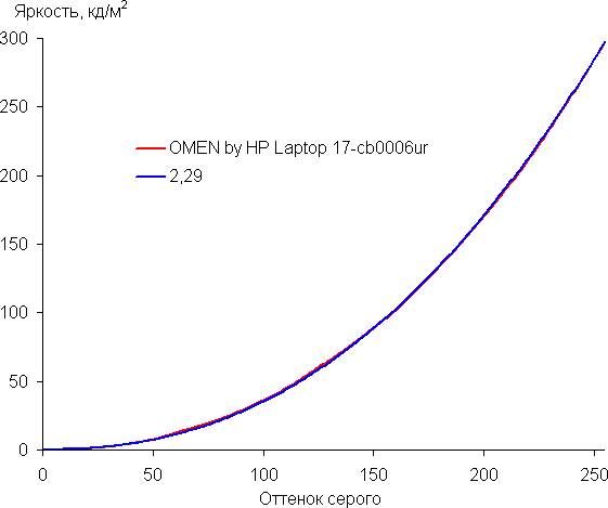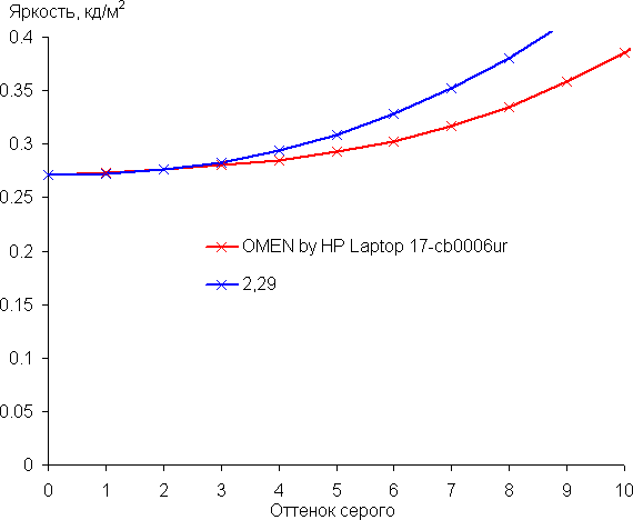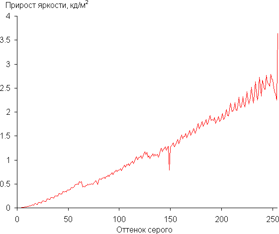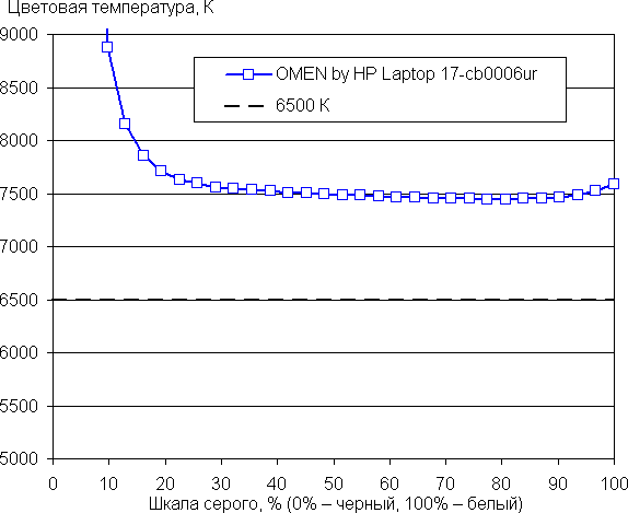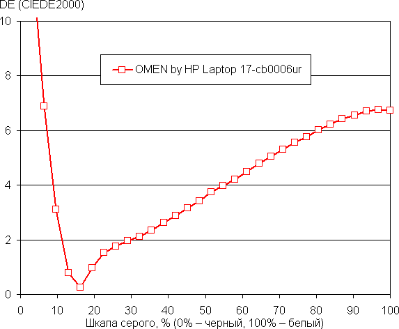 Баланс оттенков на шкале серого приемлемый, так как цветовая температура не сильно выше стандартных 6500 К, и отклонение от спектра абсолютно черного тела (ΔE) ниже 10, что для потребительского устройства считается хорошим показателем. При этом хотя бы цветовая температура мало изменяется от оттенка к оттенку — это положительно сказывается на визуальной оценке цветового баланса. (Самые темные области шкалы серого можно не учитывать, так как там баланс цветов не имеет большого значения, да и погрешность измерений цветовых характеристик на низкой яркости большая.)