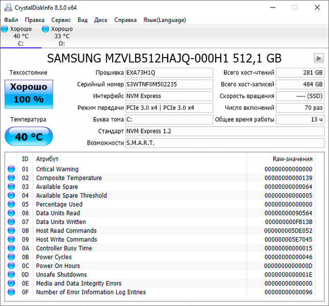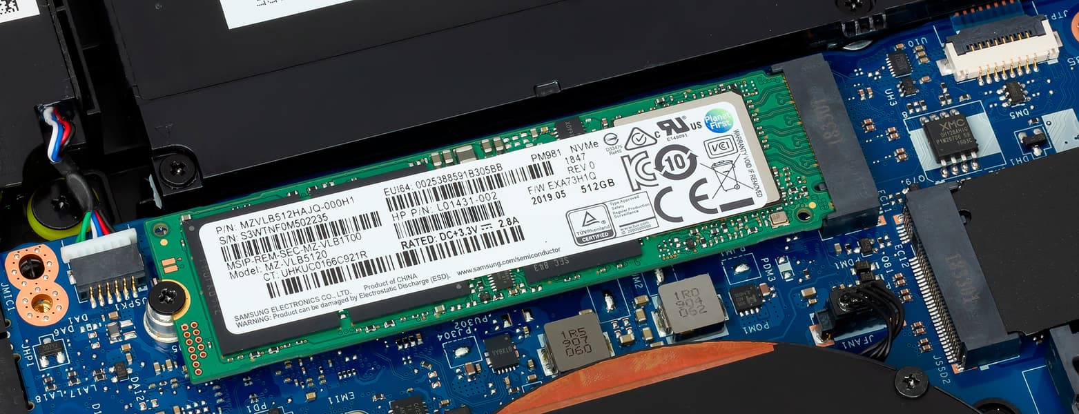 Под ней скрывается 512-гигабайтный твердотельный диск Samsung PM981 (модель MZVLB512HAJQ-000H1) в форм-факторе M.2 2280.