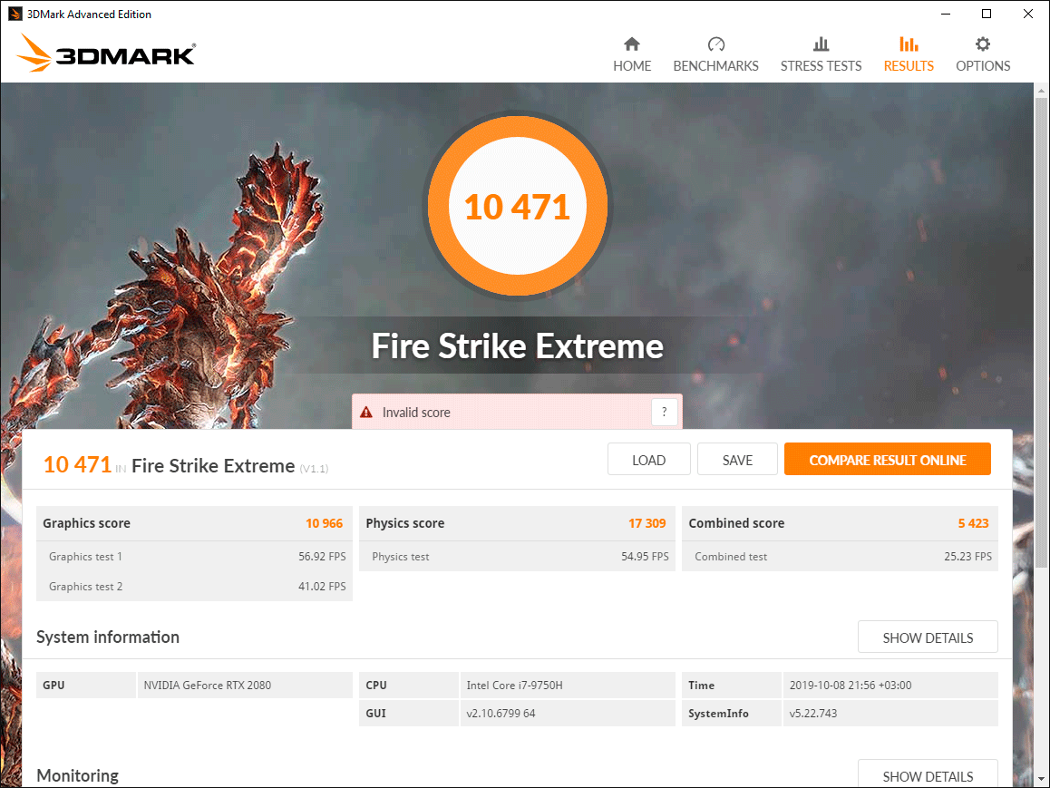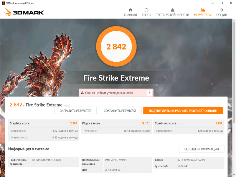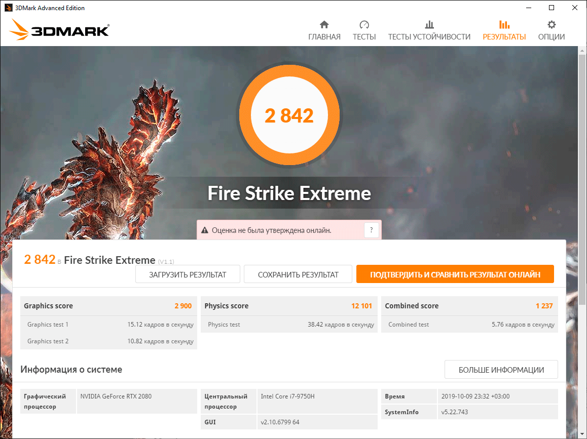 Для проверки по такому же принципу графической подсистемы Omen 17-CB0006UR мы использовали тест стабильности Fire Strike Extreme из пакета 3DMark, а для мониторинга — утилиты MSI Afterburner и GPU-Z. Сначала посмотрим на результаты тестирования при питании от электросети.