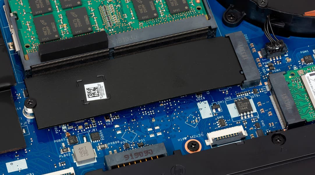 В ноутбуке два накопителя: SSD и HDD. Первый установлен в разъем M.2 и закрыт металлической пластинкой-теплораспределителем.