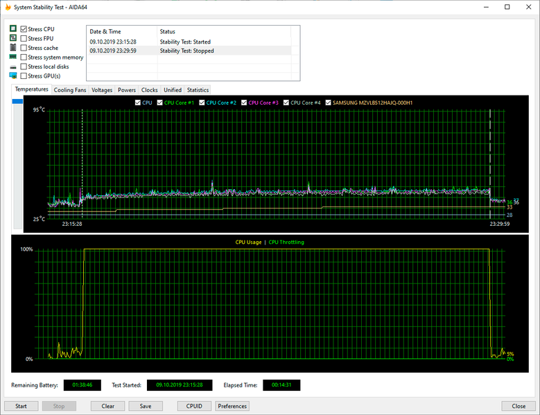 В режиме работы Комфортный частота процессора в нагрузке стабилизировалась на отметке 3,6 ГГц при напряжении 1,074 В и уровне TDP 45 Вт. Температуры в начале теста резко рванули вверх, но затем отреагировала система охлаждения, снизив температуру процессора до 70 градусов Цельсия и стабилизировав ее затем у этой отметки. В режиме По умолчанию частота процессора оказалась на 100 МГц выше, а напряжение держалось на 1,096 В при том же уровне TDP. Турбины системы охлаждения в этом профиле настроек работали на меньшей скорости, что было очевидно по уровню шума, но температуры были выше в среднем на 5 градусов Цельсия. Наконец, в третьем режиме с названием Производительный процессор под нагрузкой работал на частоте 3,9 ГГц при напряжении 1,168 В, а показатель энергопотребления процессора достиг отметки 60 Вт. Турбины в этом случае сразу же работают на полную мощность при высоком уровне шума. Отметим, что ни в одном из трех протестированных режимов работы ноутбука пропуска тактов CPU зафиксировано не было.