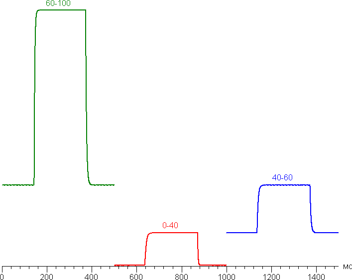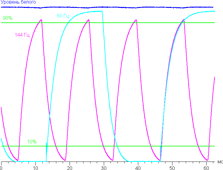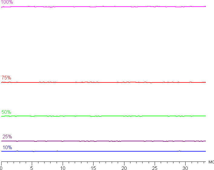 На любом уровне яркости значимая модуляция подсветки отсутствует, поэтому нет и никакого мерцания экрана. В доказательство приведем графики зависимости яркости (вертикальная ось) от времени (горизонтальная ось) при различных значениях настройки яркости: