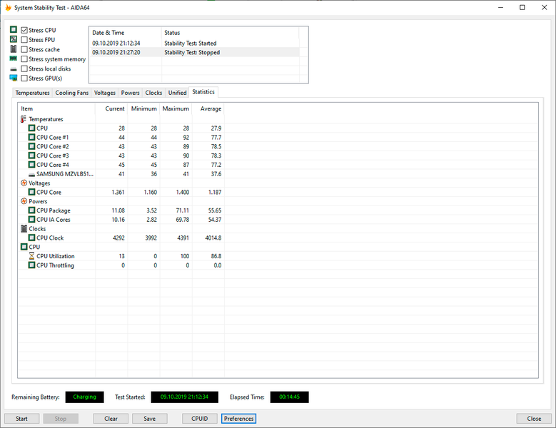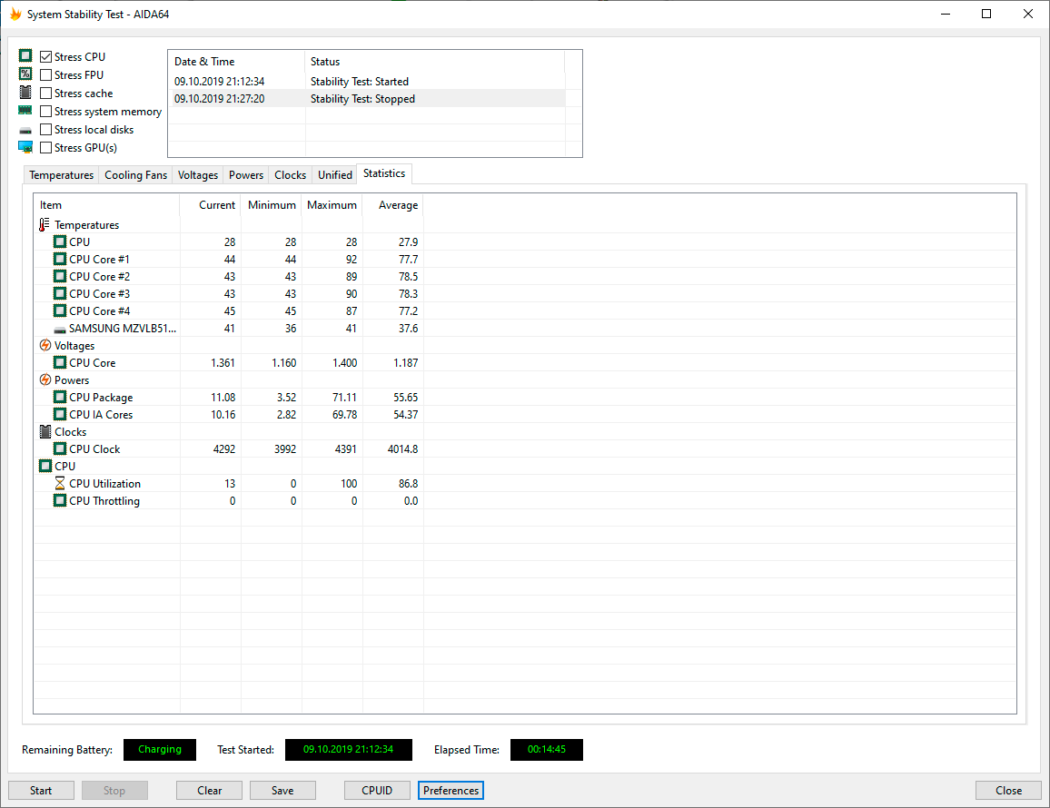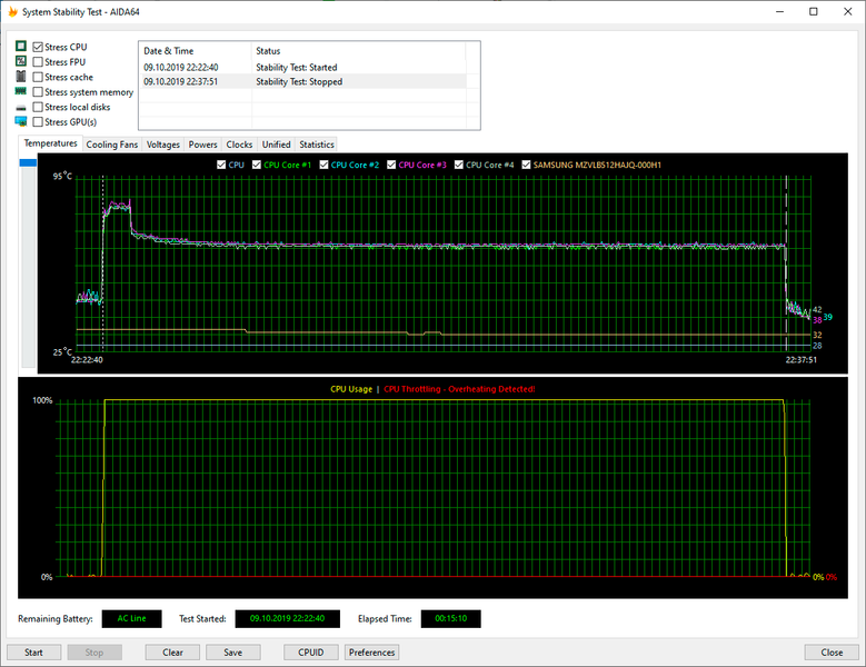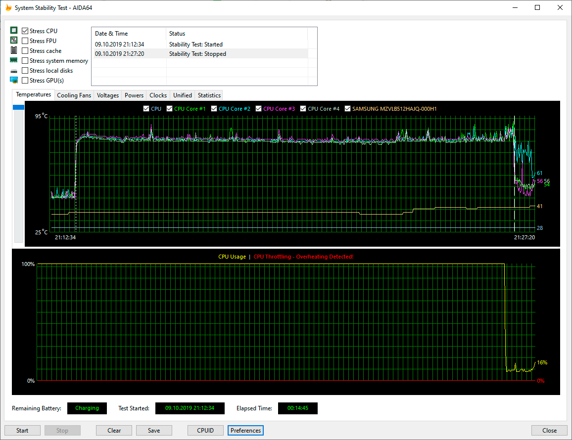 Мы протестировали Omen 17-CB0006UR во всех трех режимах при питании как от электросети, так и от аккумулятора. Для проверки работы ноутбука в этих режимах мы использовали стресс-тест CPU из программы AIDA64 Extreme. Все тесты проводились под управлением операционной системы Windows 10 Pro x64 с установкой последних доступных драйверов и обновлений. Температура в помещении во время тестирования находилась у отметки 24 градуса Цельсия.