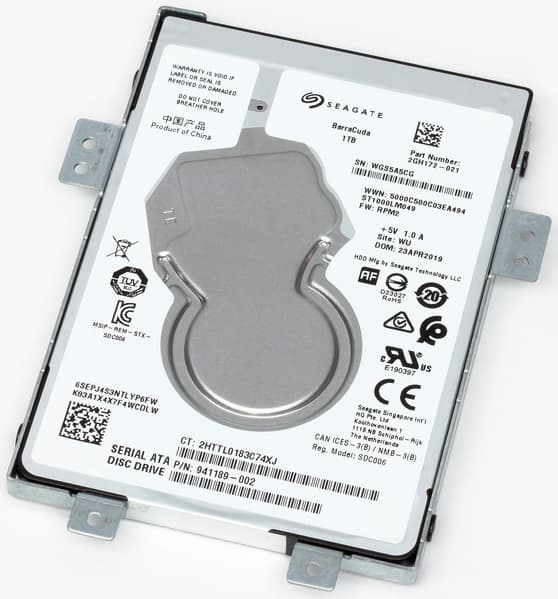 Второй накопитель ноутбука представлен 2,5-дюймовым жестким диском объемом 1 ТБ, выпущенным компанией Seagate (модель BarraCuda с маркировкой ST1000LM049).