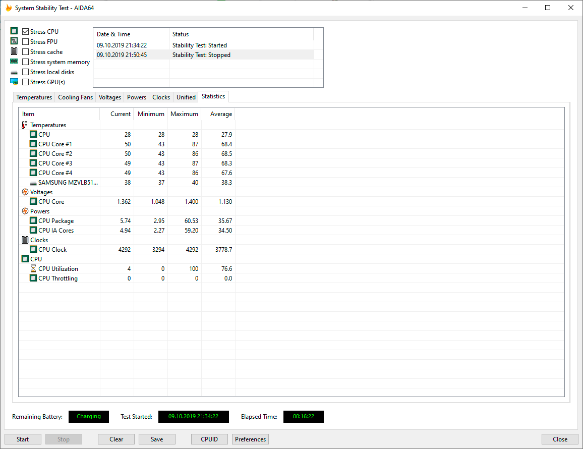 Сначала посмотрим на данные мониторинга при работе ноутбука от электросети.