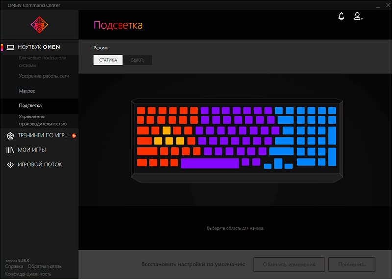 Клавиатура Omen 17-CB0006UR оснащена трехзонной подсветкой, настройка которой возможна через уже упомянутое приложение Omen Command Center.