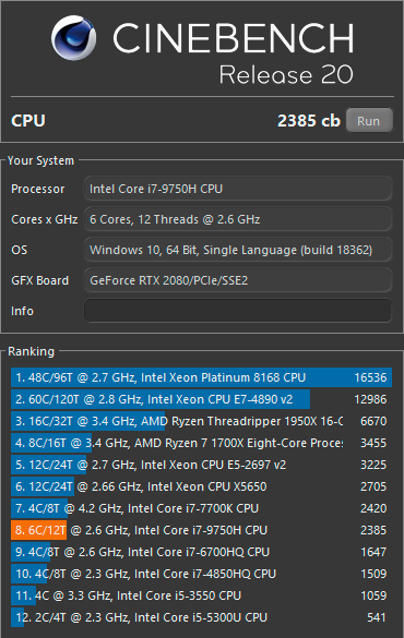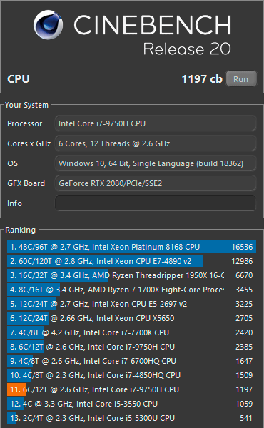 В качестве центрального процессора здесь используется шестиядерный Intel Core i7-9750H с частотами от 2,6 до 4,5 ГГц и тепловым пакетом 45 Вт.