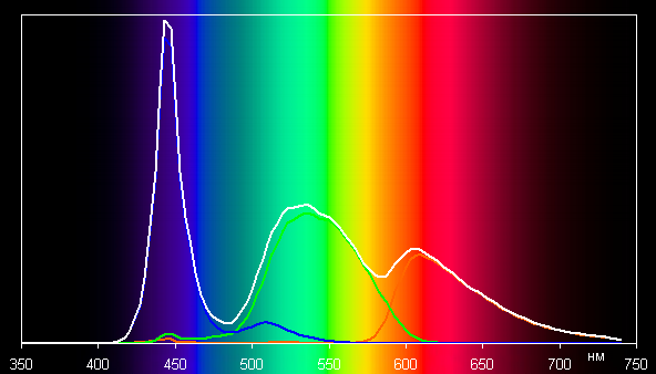 Поэтому визуально цвета на этом экране имеют естественную насыщенность. Ниже приведен спектр для белого поля (белая линия), наложенный на спектры красного, зеленого и синего полей (линии соответствующих цветов):