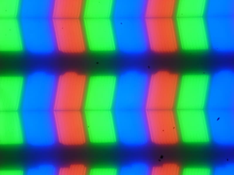 В этом ноутбуке используется матрица типа IPS. Микрофотографии демонстрируют типичную для IPS структуру субпикселей (черные точки — это пыль на матрице фотоаппарата):