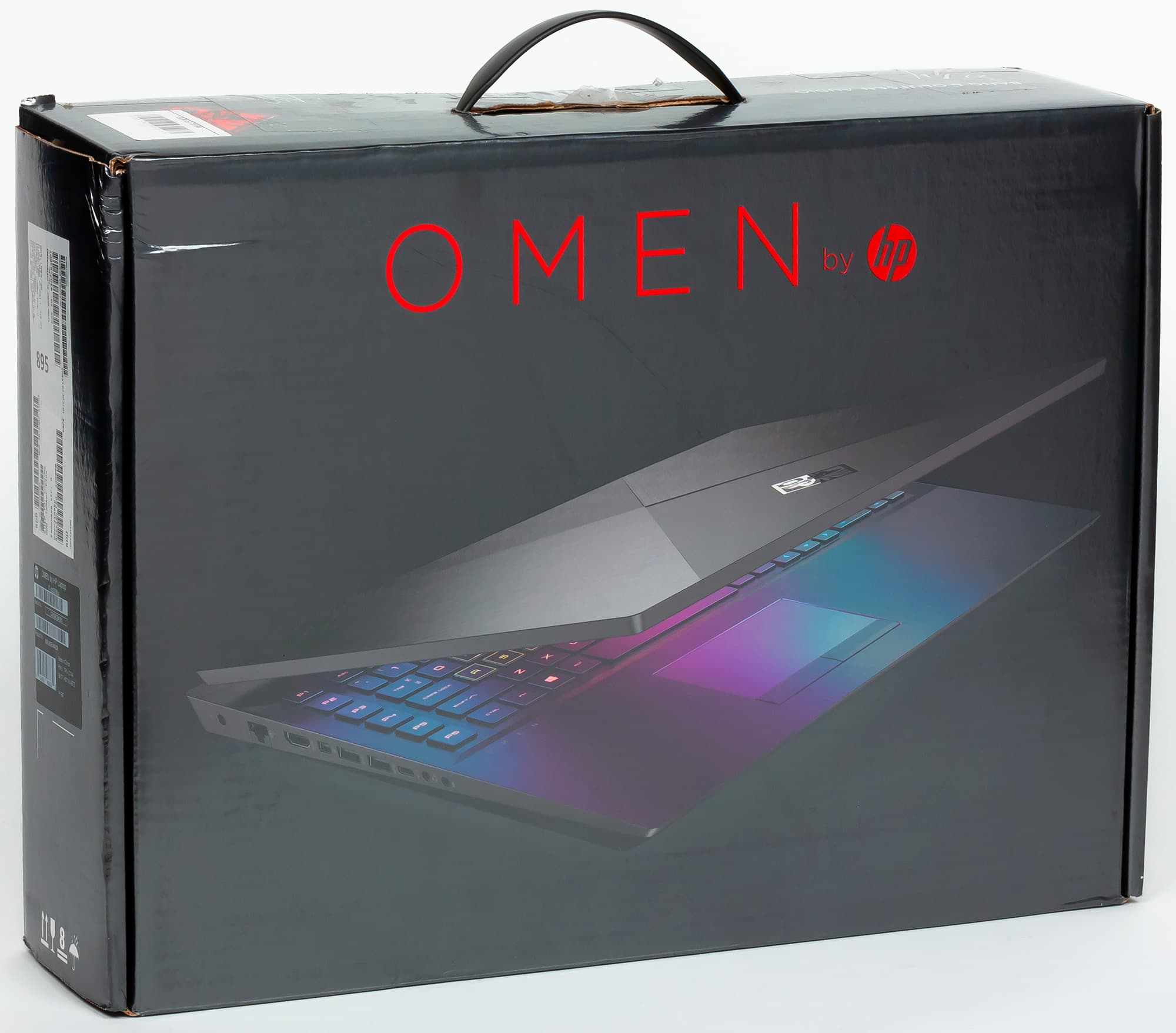 Omen 17-CB0006UR поставляется в большой картонной коробке, оснащенной пластиковой ручкой для переноски. На лицевой стороне коробки приведено фото ноутбука и указано название модели, а его детальную расшифровку можно найти на одном из торцов коробки.