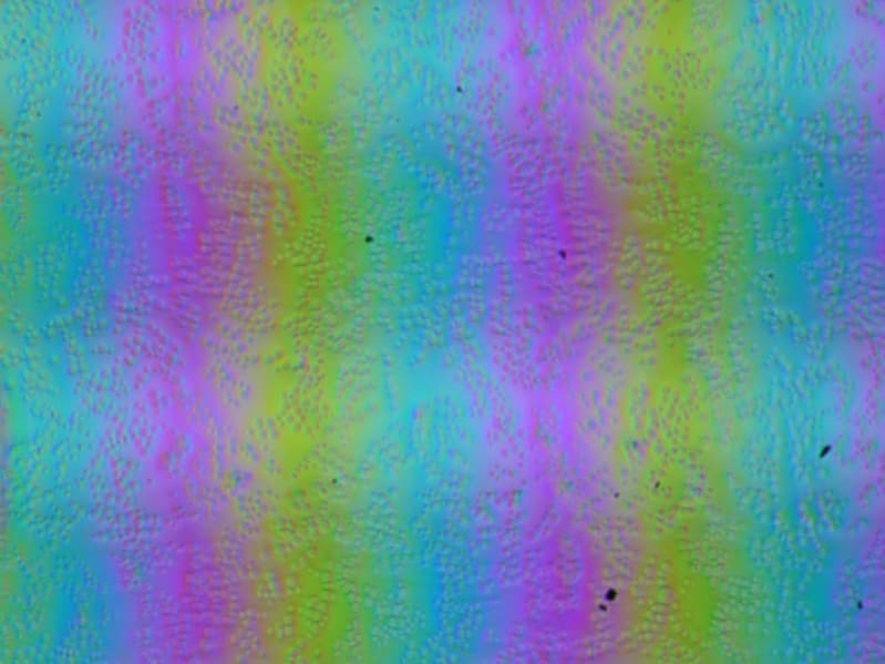 Зерно этих дефектов в несколько раз меньше размеров субпикселей (масштаб этих двух фотографий примерно одинаковый), поэтому фокусировка на микродефектах и «перескок» фокуса по субпикселям при изменении угла зрения выражены слабо, из-за этого нет и «кристаллического» эффекта.