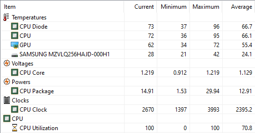 Вы можете удивиться, но в двух этих режимах ноутбук HP ProBook 455 G7 ведет себя практически одинаково. Разница лишь в том, что при работе от адаптера питания частота процессора кратковременно повышалась до 4 ГГц, тогда как при работе от аккумулятора она не превышала отметку 3,45 ГГц. Но финальная частота CPU у этих двух режимов одинакова: 2,7 ГГц при потреблении 15 Вт. Одинаковой получается и температура процессора, в пике достигающая 96 °C, а затем стабилизирующаяся на 72-74 градусах.