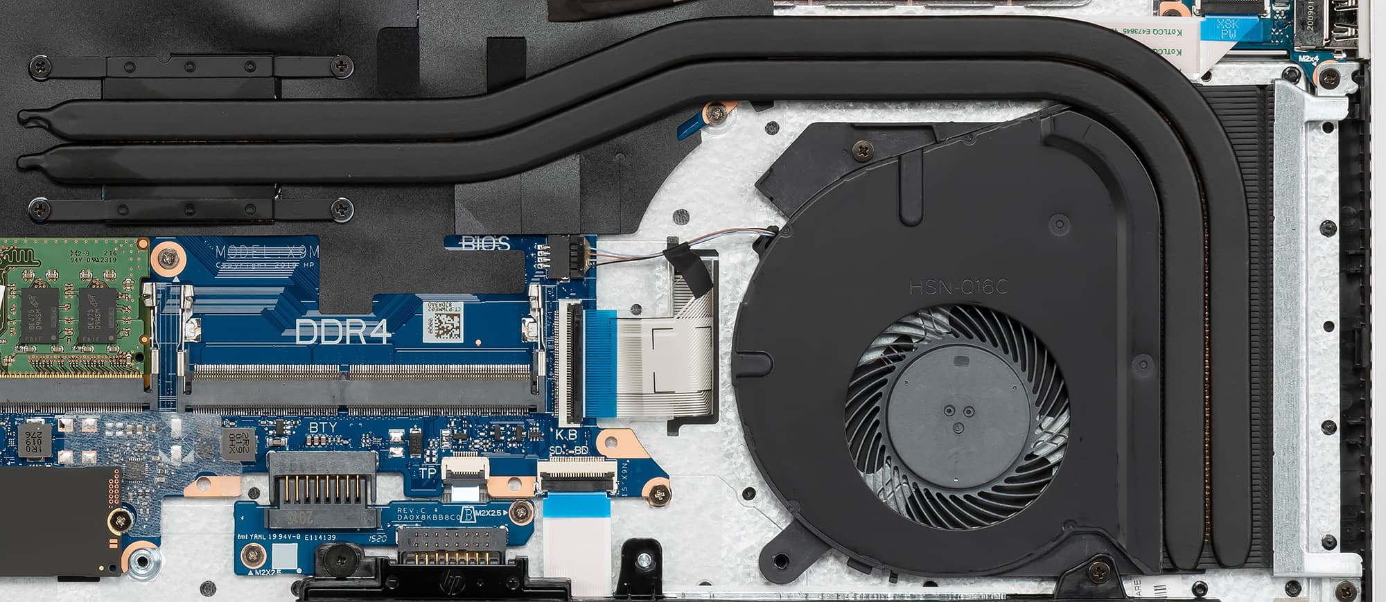 В системе охлаждения ноутбука используется медный радиатор с двумя тепловыми трубками и тонкий вентилятор с плоскими лопастями.