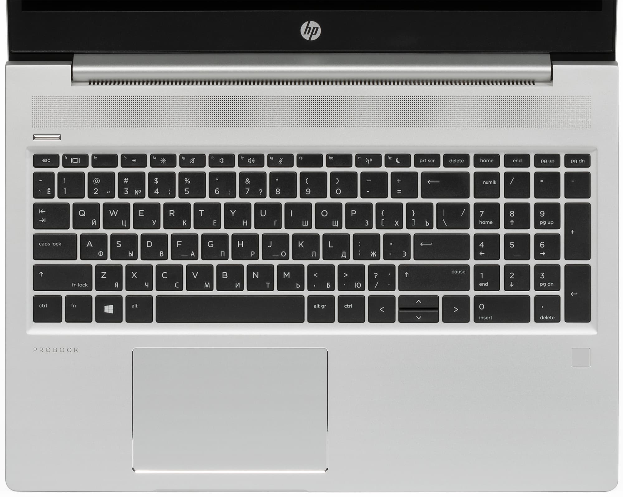 В HP ProBook 455 G7 реализована клавиатура мембранного типа с блоком цифровых клавиш и регулируемой подсветкой. Размеры клавиш с буквами составляют 15×15 мм, а клавиши функционального ряда вдвое у́же.