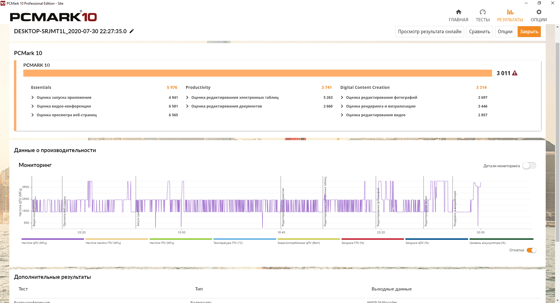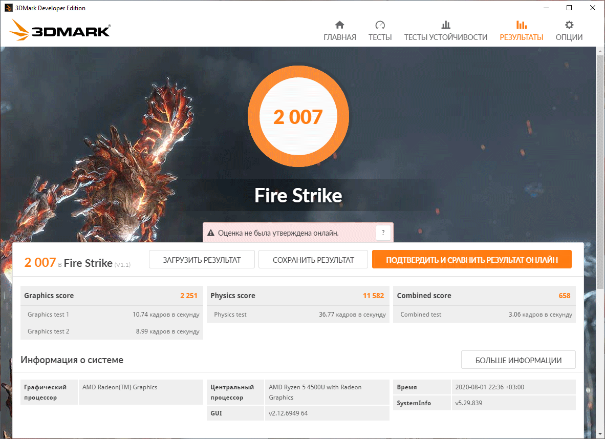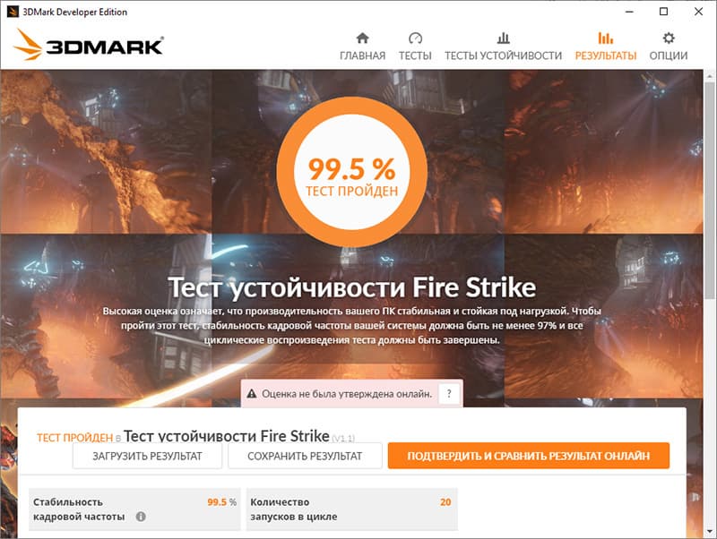 У данной модели ноутбука нет дискретной видеокарты, только встроенное в процессор графическое ядро, но его мы тоже протестировали на предмет температурного режима работы, использовав для этого 20 циклов теста Fire Strike из пакета 3DMark.