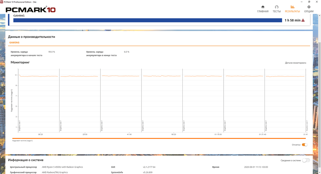 Первые тесты автономности HP ProBook 455 G7 мы проводили с помощью тестового пакета PCMark’10 в режимах Modern Office и Gaming. Яркость дисплея фиксировалась на 46%, что эквивалентно 100 кд/м². Сетевые соединения не отключались. В результате при эмуляции повседневной работы (Modern Office) ноутбук продержался почти 9 часов, чего будет вполне достаточно, если, конечно, вы не фанат-трудоголик, спящий по 4 часа в день.