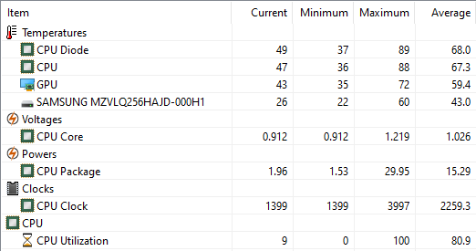Пиковые температуры процессора оказались даже немного ниже, чем при индивидуальной нагрузке с помощью FPU-теста, но общий тренд такой же, как и в тесте AIDA64 Extreme: запуск на 4 ГГц и затем плавное снижение до 2,2 ГГц и ниже.