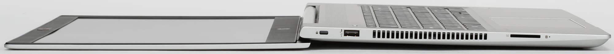 Все разъемы и порты расположены на боковых сторонах корпуса. На левый торец выведены кенсингтонский замок, порт USB 2.0, вентиляционная решетка, через которую выбрасывается нагретый воздух, и слот под карты памяти SD.