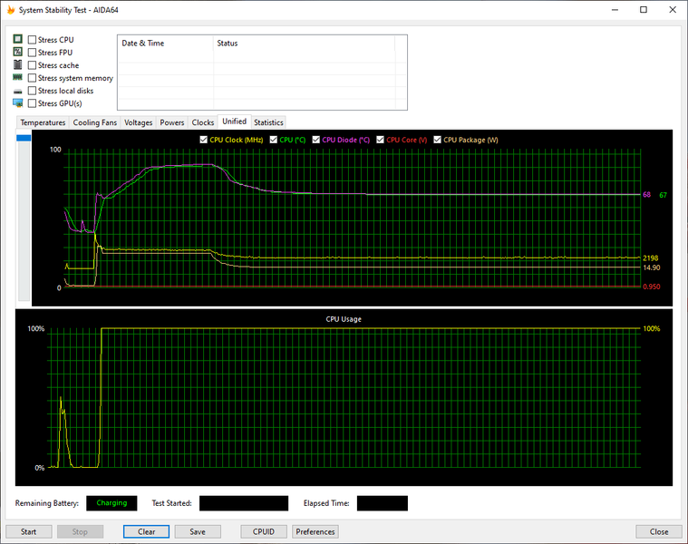 Температурный режим работы HP ProBook 455 G7 мы проверили при подключении к электросети и при работе от аккумулятора, используя для нагрузки стресс-алгоритм FPU утилиты AIDA64 Extreme. Все тесты проводились под управлением операционной системы Windows 10 с установкой последних доступных драйверов и обновлений. Температура в помещении во время тестирования составляла около 25 °C. Посмотрим на результаты.