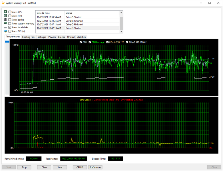 При работе ноутбука от аккумулятора мы получили следующие результаты стресс-теста.