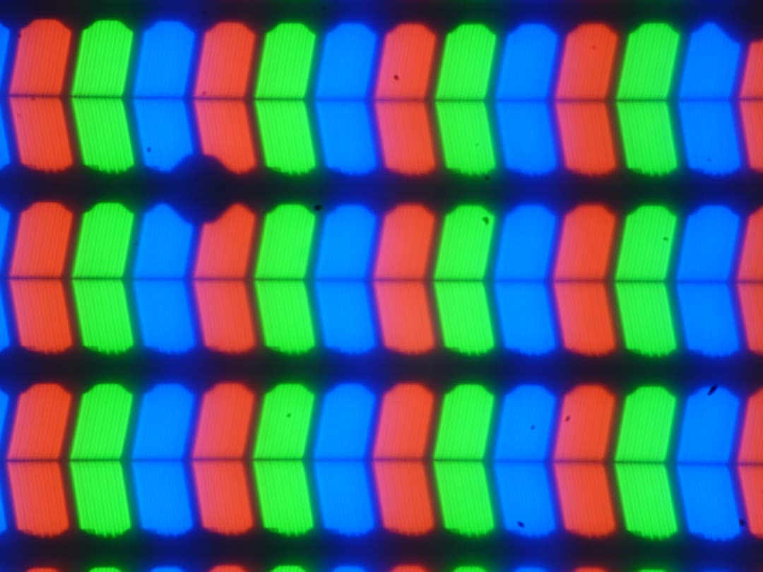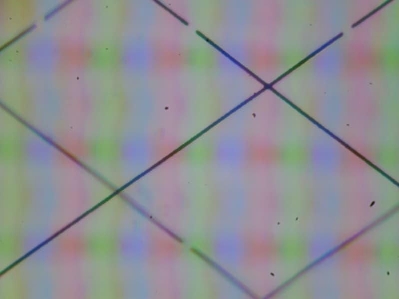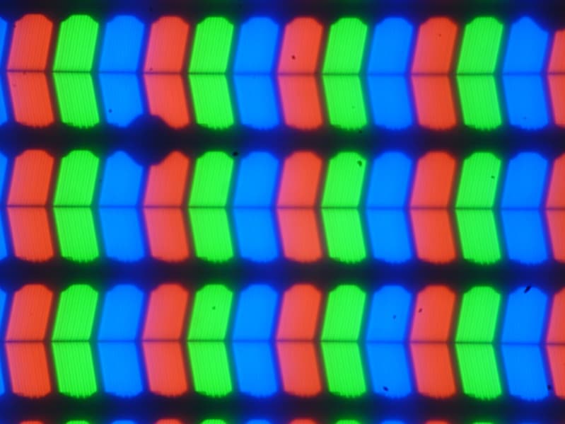 В этом ноутбуке используется матрица типа IPS, выполненная по технологии LTPS. Микрофотографии демонстрируют типичную для IPS структуру субпикселей (черные точки — это пыль на матрице фотоаппарата):