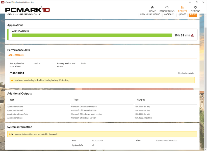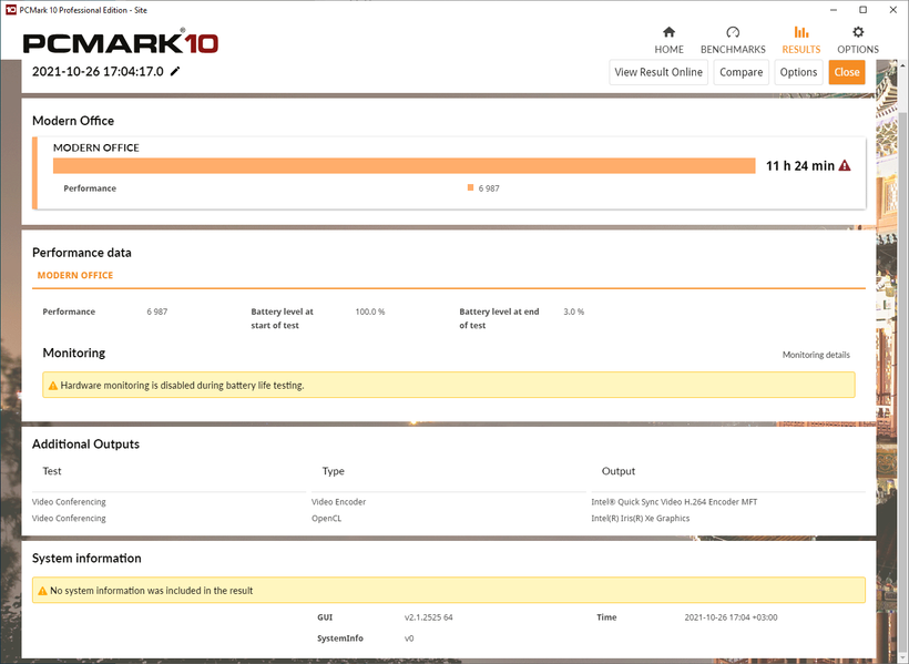 Мы проводили тесты автономности Huawei MateBook 14s с помощью пакета PCMark’10 при яркости экрана 100 кд/м² (40% по шкале яркости). Частота дисплея составляла 90 Гц, сеть и звук не отключались. Посмотрим на результаты.