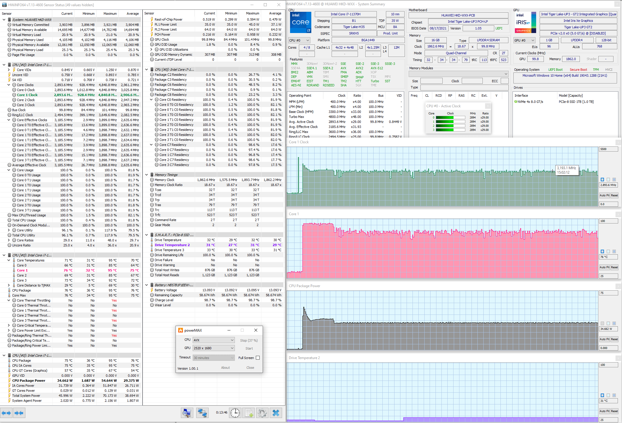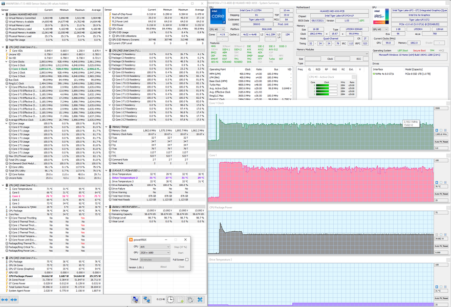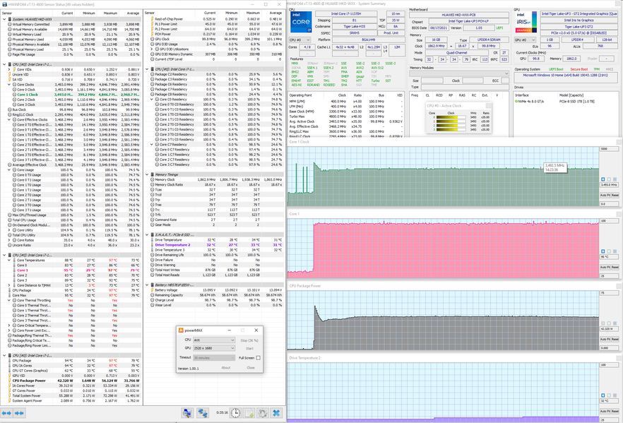 Мы протестировали Huawei MateBook 14s и его систему охлаждения в стресс-тесте powerMax (с использованием AVX-инструкций) при питании от комплектного адаптера в двух режимах, получив следующие результаты.