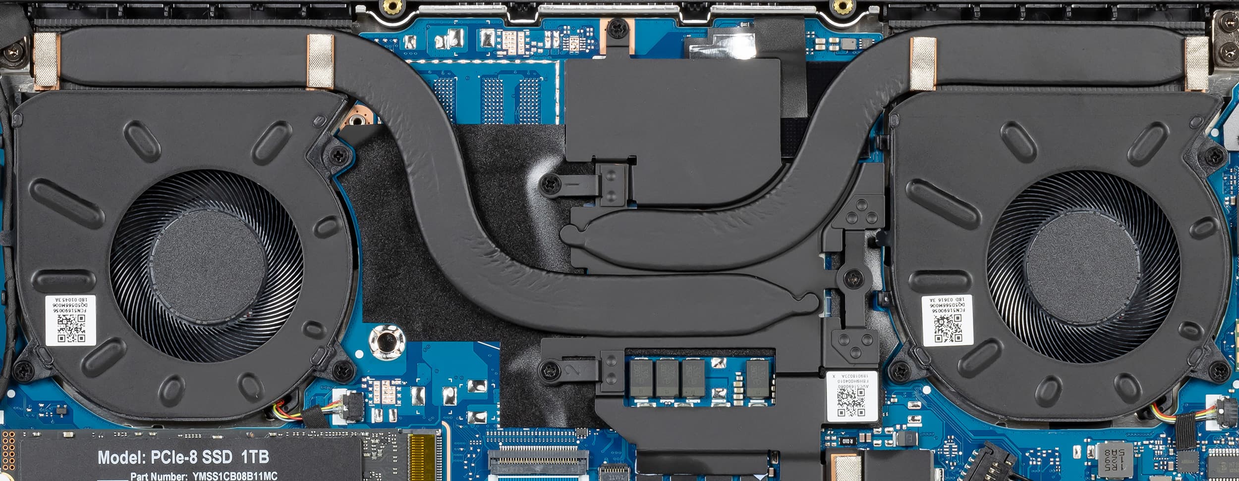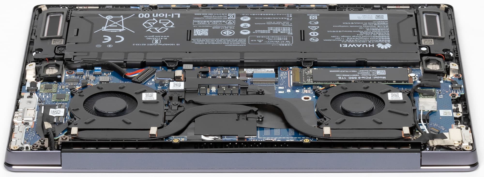 В сравнении с MateBook 14 2021 система охлаждения претерпела изменения, что не удивительно, так как тепловой пакет нового процессора на 25% выше, чем у прежнего. В ней увеличены радиаторы, диаметр вентиляторов и (с 6 до 8 мм) размер второй тепловой трубки.