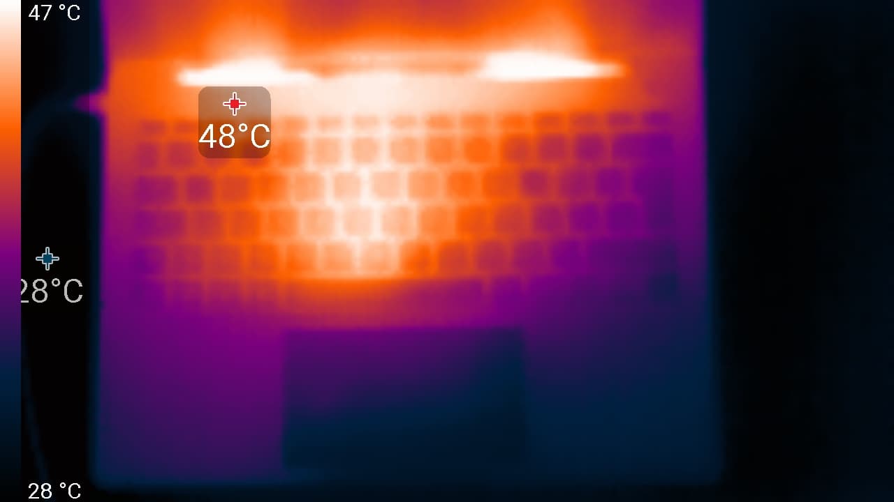 Под максимальной нагрузкой работать с клавиатурой комфортно, так как места под запястьями едва нагреваются. Однако держать ноутбук на коленях неприятно, поскольку колени ощущают нагрев днища ноутбука. Блок питания греется очень сильно, поэтому при долговременной работе с высокой производительностью лучше следить, чтобы он не был ничем накрыт.