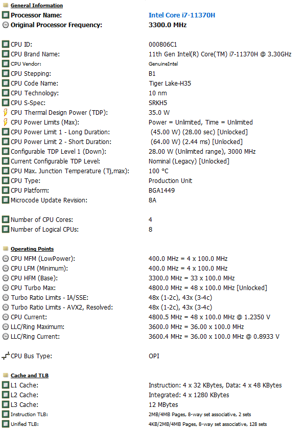 | Центральный процессор | Intel Core i7-11370H (Tiger Lake H35, 10 нм, 4 ядра/8 потоков, 3,3—4,8 ГГц, L3-кэш 12 МБ, макс. TDP 35 Вт) | |