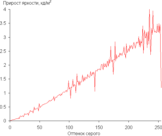 Далее мы измерили яркость 256 оттенков серого (от 0, 0, 0 до 255, 255, 255). График ниже показывает прирост (не абсолютное значение!) яркости между соседними полутонами: