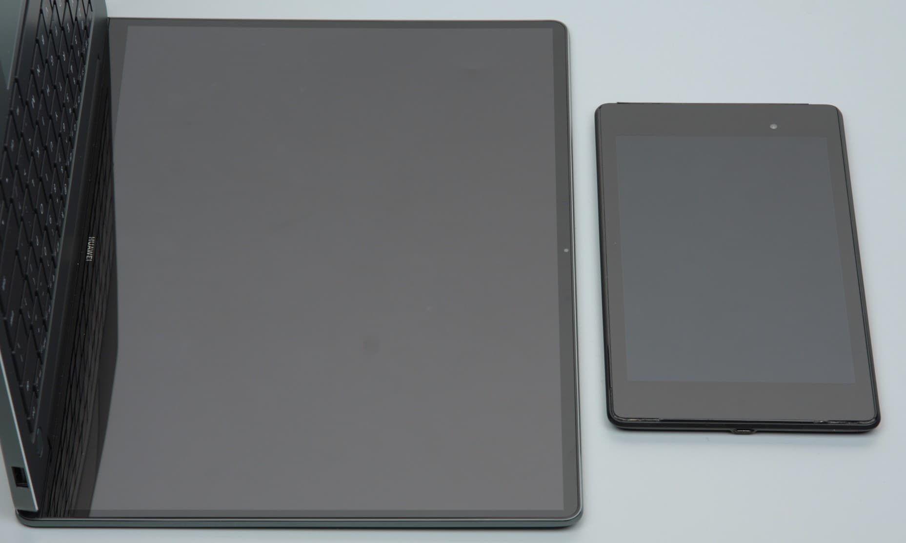 Лицевая поверхность экрана изготовлена из стеклянной пластины, устойчивой к появлению царапин. Экран снаружи зеркально-гладкий. На внешней поверхности экрана есть специальное олеофобное (жироотталкивающее) покрытие, которое по эффективности заметно лучше, чем у экрана планшета Google Nexus 7 (2013) (далее просто Nexus 7), поэтому следы от пальцев удаляются существенно легче, а появляются с меньшей скоростью, чем в случае обычного стекла. Экран сенсорный, датчик распознает до 10 прикосновений одновременно. Судя по яркости отраженных объектов, антибликовые свойства экрана не хуже, чем у Nexus 7. Для наглядности приведем фотографию, на которой в экранах обоих устройств отражается белая поверхность (где что — разобраться несложно):