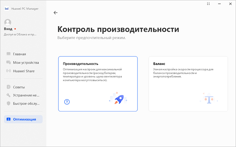 В утилите Huawei PC Manager доступны два режима работы ультрабука: «Производительность» и «Баланс», которые можно переключать и сочетанием клавиш Fn+P.
