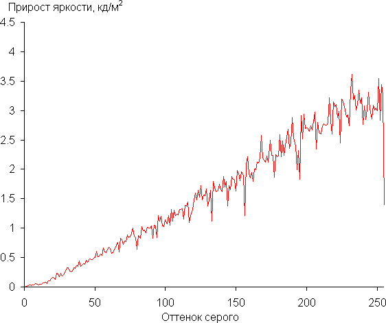 Далее мы измерили яркость 256 оттенков серого (от 0, 0, 0 до 255, 255, 255). График ниже показывает прирост (не абсолютное значение!) яркости между соседними полутонами: