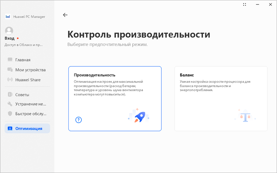 В программном обеспечении Huawei PC Manager для выбора доступны два режима работы: Производительность и Баланс.