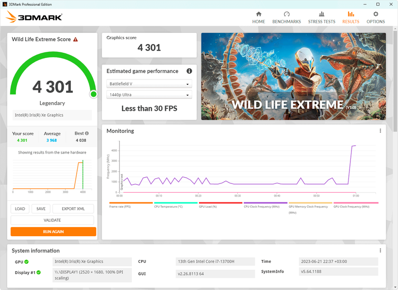 В самом начале теста частота производительных ядер процессора повышается до 4,5 ГГц, а энергоэффективных — до 3,2 ГГц, однако длится этот «праздник» совсем недолго, поскольку процессор перегревается и активируется тротлинг. Далее частота P-ядер сбрасывается до 2,8 ГГц, и в дело плавно вступает система охлаждения, вентиляторы которой удерживают температуры от повышения до критических границ. Стабилизация в производительном режиме происходит на частоте ядер 3,0 ГГц при энергопотреблении процессора 45 ватт и температурах 89—94 °C, а в сбалансированном режиме работы стабилизация происходит на частотах около 2,7 ГГц при 35 ваттах и температурах 77—81 °C. Уровень шума в обоих случаях умеренный, а без нагрузки ноутбук работает бесшумно.