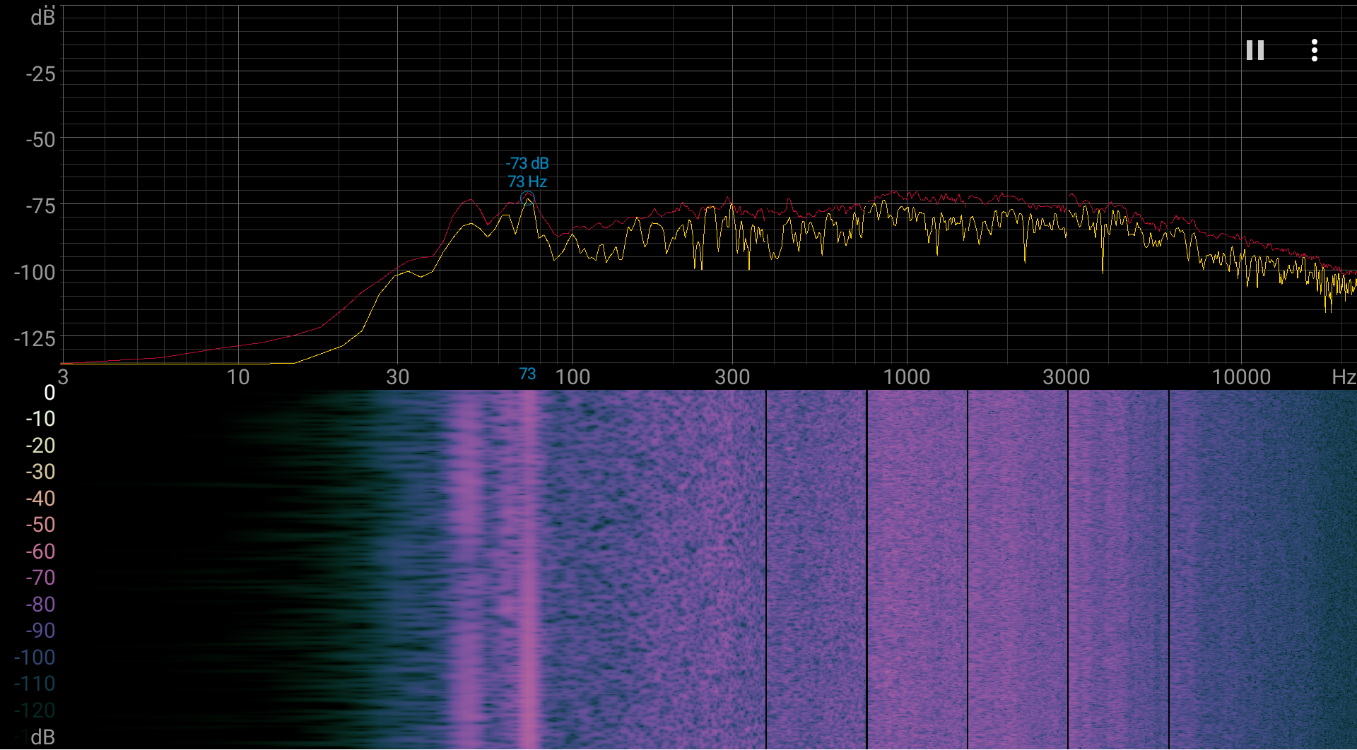 Измерение громкости встроенных громкоговорителей проводилось при воспроизведении звукового файла с розовым шумом. Максимальная громкость оказалась равна 79,0 дБА. Среди ноутбуков, протестированных к моменту написания данной статьи, этот ноутбук заметно громче среднего по громкости (74,0 дБА). Спектрограмма белого шума показывает, что выраженных резонансных пиков нет, низких частот нет, а в области между средними и высокими частотами есть провал: