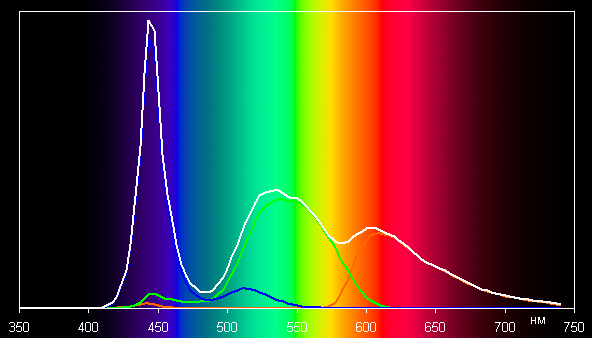 Такой спектр с относительно узким пиком синего и с широкими горбами зеленого и красного цветов характерен для экранов, в которых используется белая светодиодная подсветка с синим излучателем и желтым люминофором.