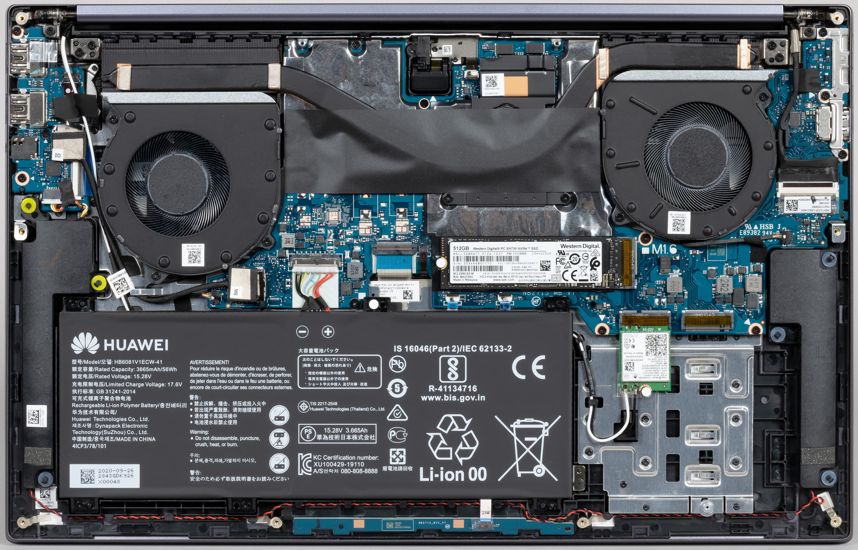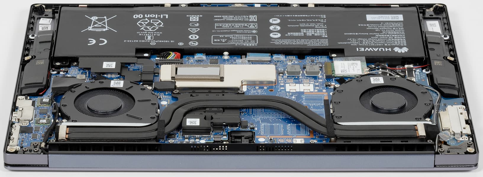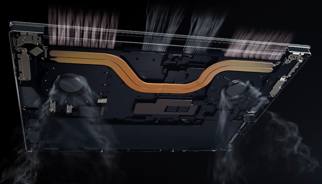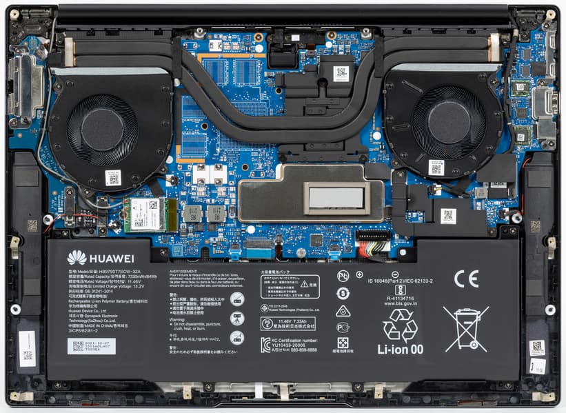 В сравнении с предыдущей моделью Huawei MateBook с 16-дюймовым экраном у новой модели вместо одной 8-миллиметровой тепловой трубки появилось две 6-миллиметровых, вентиляторы увеличены в диаметре до 75 мм и получили S-образные лопасти из тончайшего прочного пластика. Благодаря этому, по заявлениям производителя, эффективность системы охлаждения возросла на 30%.