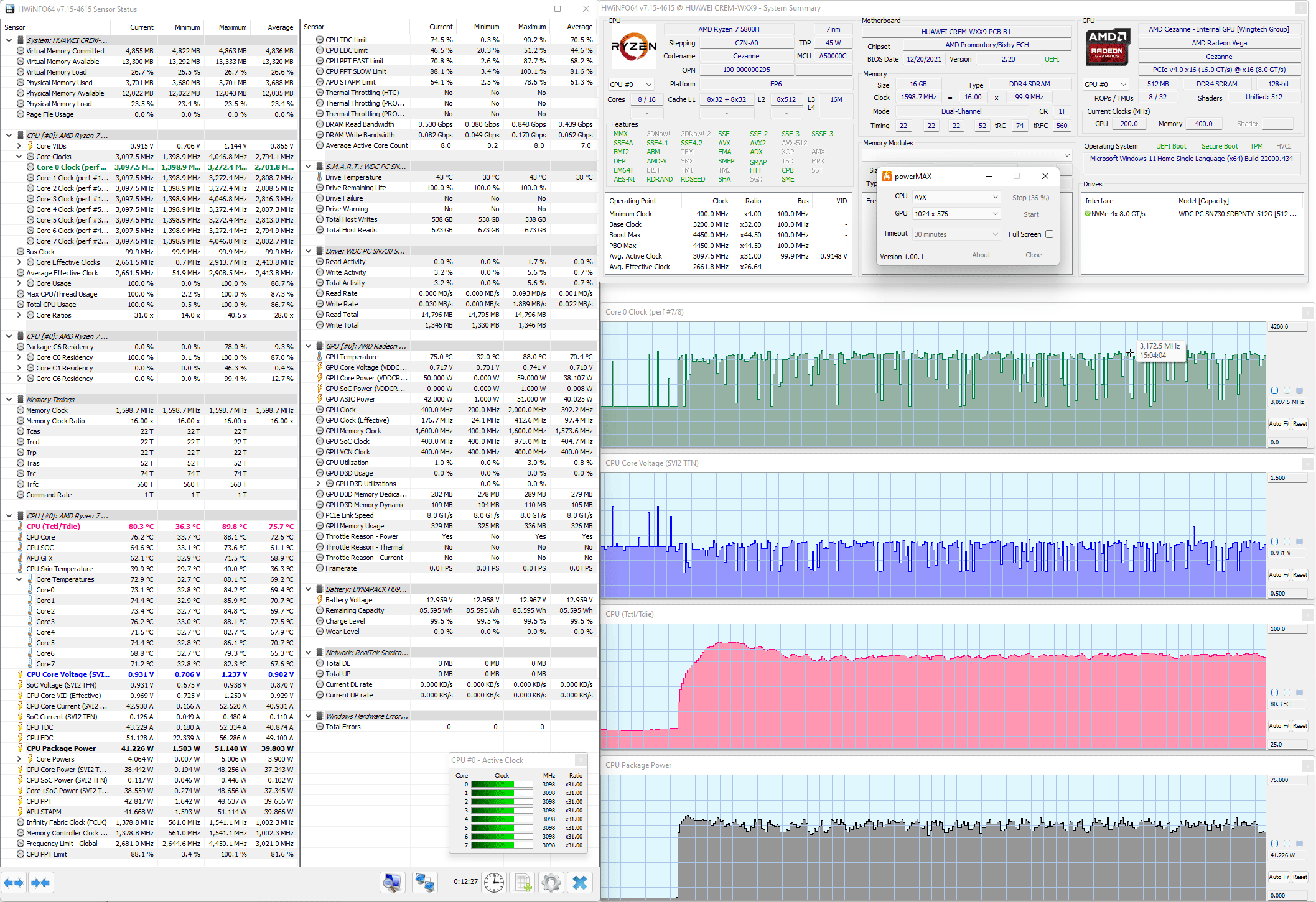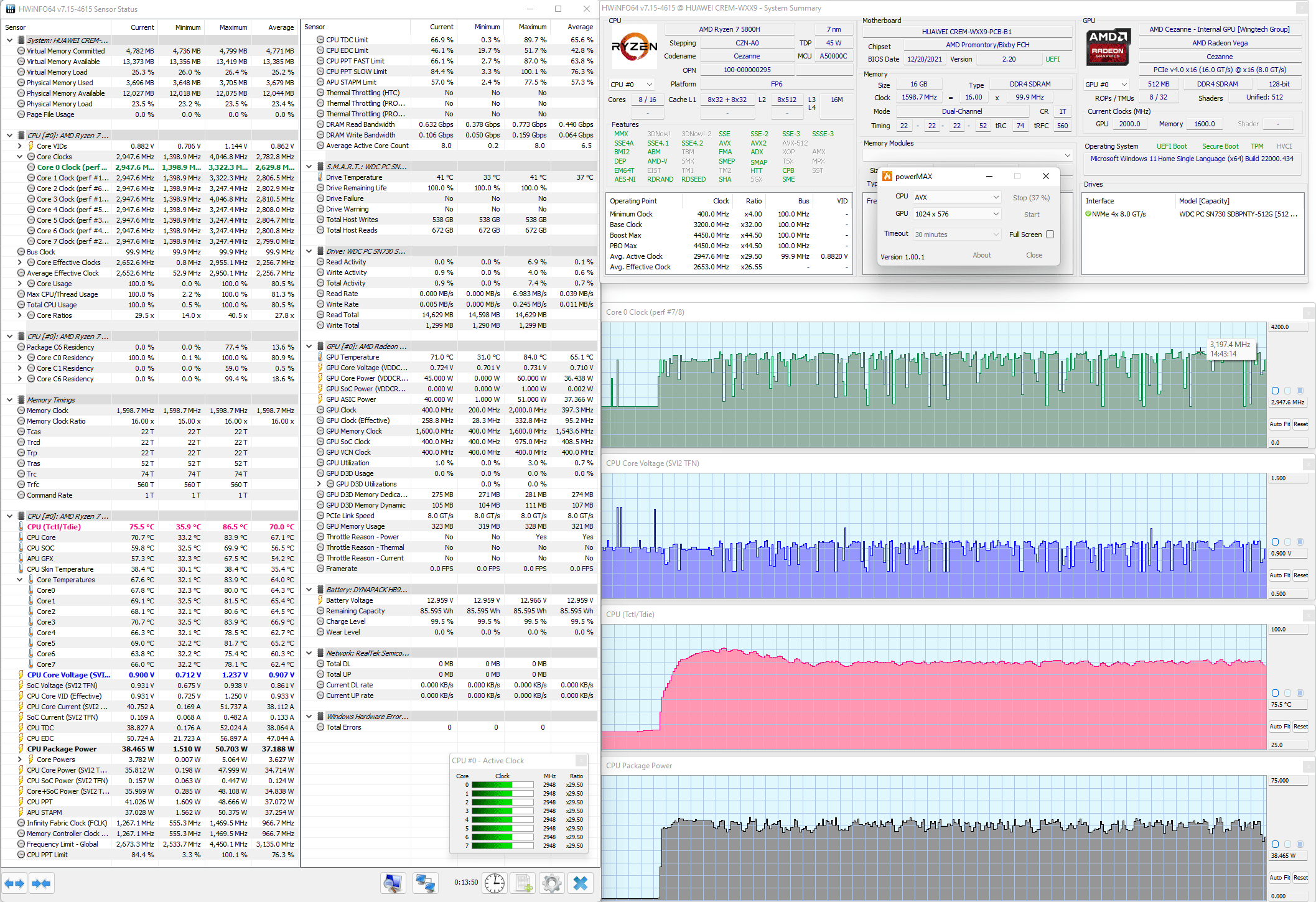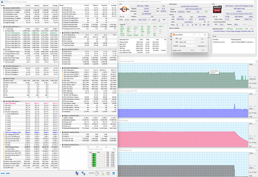 Эффективность системы охлаждения Huawei MateBook 16 была проверена в стресс-тесте powerMax с использованием AVX-инструкций. За мониторинг отвечала утилита HWinfo. Результаты после стабилизации температур приведены на скриншотах.