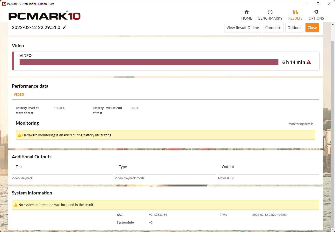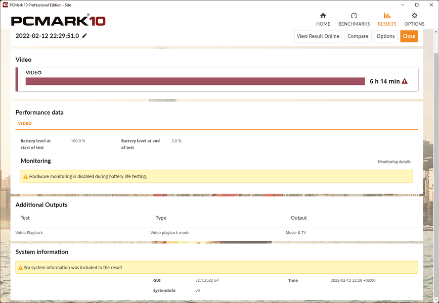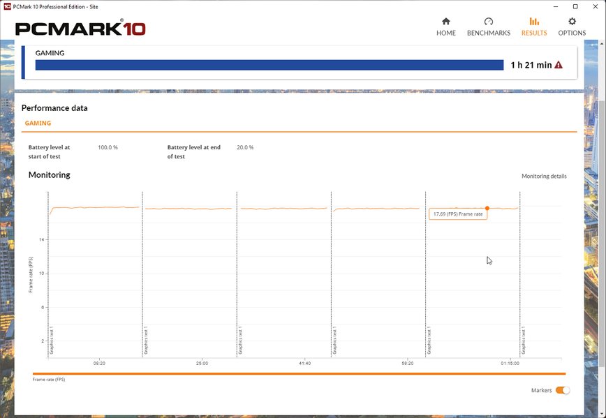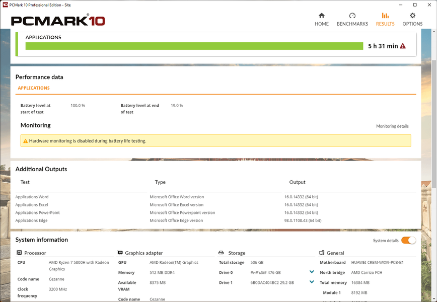 Тесты автономности были проведены при яркости экрана 100 кд/м² (35% по шкале яркости) в пакете PCMark’10 при активных сетевых соединениях и громкости звука 20%. Их результаты приведены далее на скриншотах.