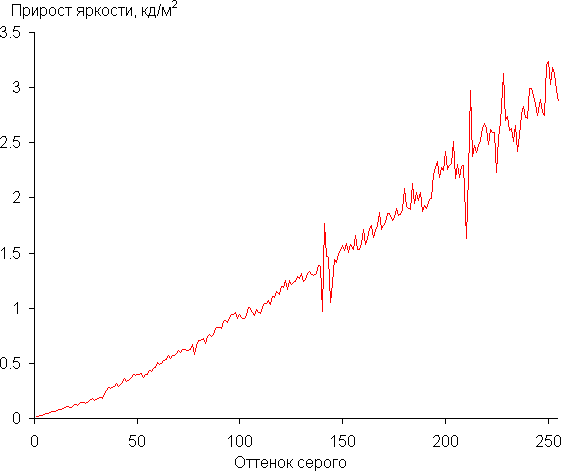 Далее мы измерили яркость 256 оттенков серого (от 0, 0, 0 до 255, 255, 255). График ниже показывает прирост (не абсолютное значение!) яркости между соседними полутонами: