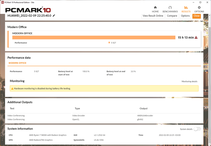В режиме теста «Modern Office» ноутбук проработал более 15 часов, и это, без оговорок, великолепный результат! В игровом режиме на Huawei MateBook 16 (Crem-WFD9) можно рассчитывать в течение примерно полутора часов (по окончании теста осталось 20% заряда), что является стандартным показателем для ноутбуков с интегрированной графикой. А вот в двух следующих режимах тестирования PCMark’10 ситуация выглядит совершенно непонятным образом.