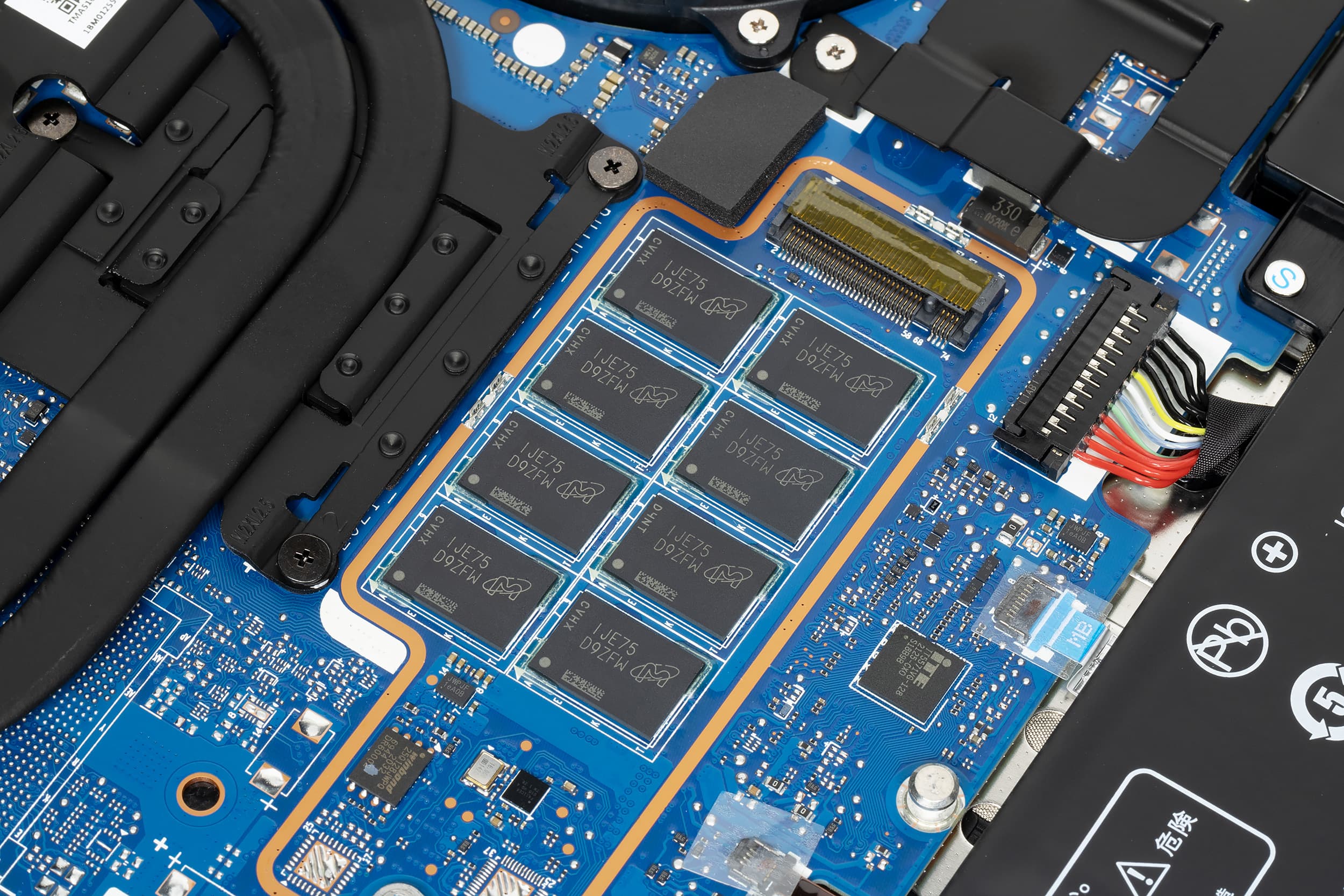 На материнской плате ноутбука присутствует один слот M.2, расположенный прямо у чипов оперативной памяти. В него установлен SSD объемом 512 ГБ производства Western Digital модели SN730 (SDBPNTY-5126). Конструктивно он устанавливается в слот таким образом, что накрывает микросхемы оперативной памяти.