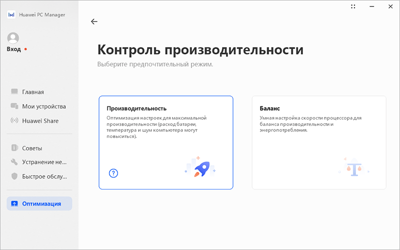 Как и прежде, в Huawei PC Manager предусмотрен раздел с выбором режима работы ноутбука: «Производительность» или «Баланс».