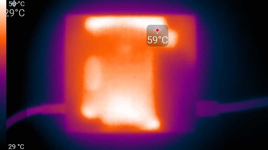 Под максимальной нагрузкой работать с клавиатурой комфортно, так как места под запястьями практически не нагреваются. Держать ноутбук на коленях при этом неприятно, поскольку колени частично соприкасаются с областями высокого нагрева. Также колени перекрывают вентиляционные решетки, что увеличивает шум и может вызвать перегрев ноутбука. Блок питания греется очень сильно, поэтому необходимо следить, чтобы при долговременной работе с высокой производительностью он не был ничем накрыт.
