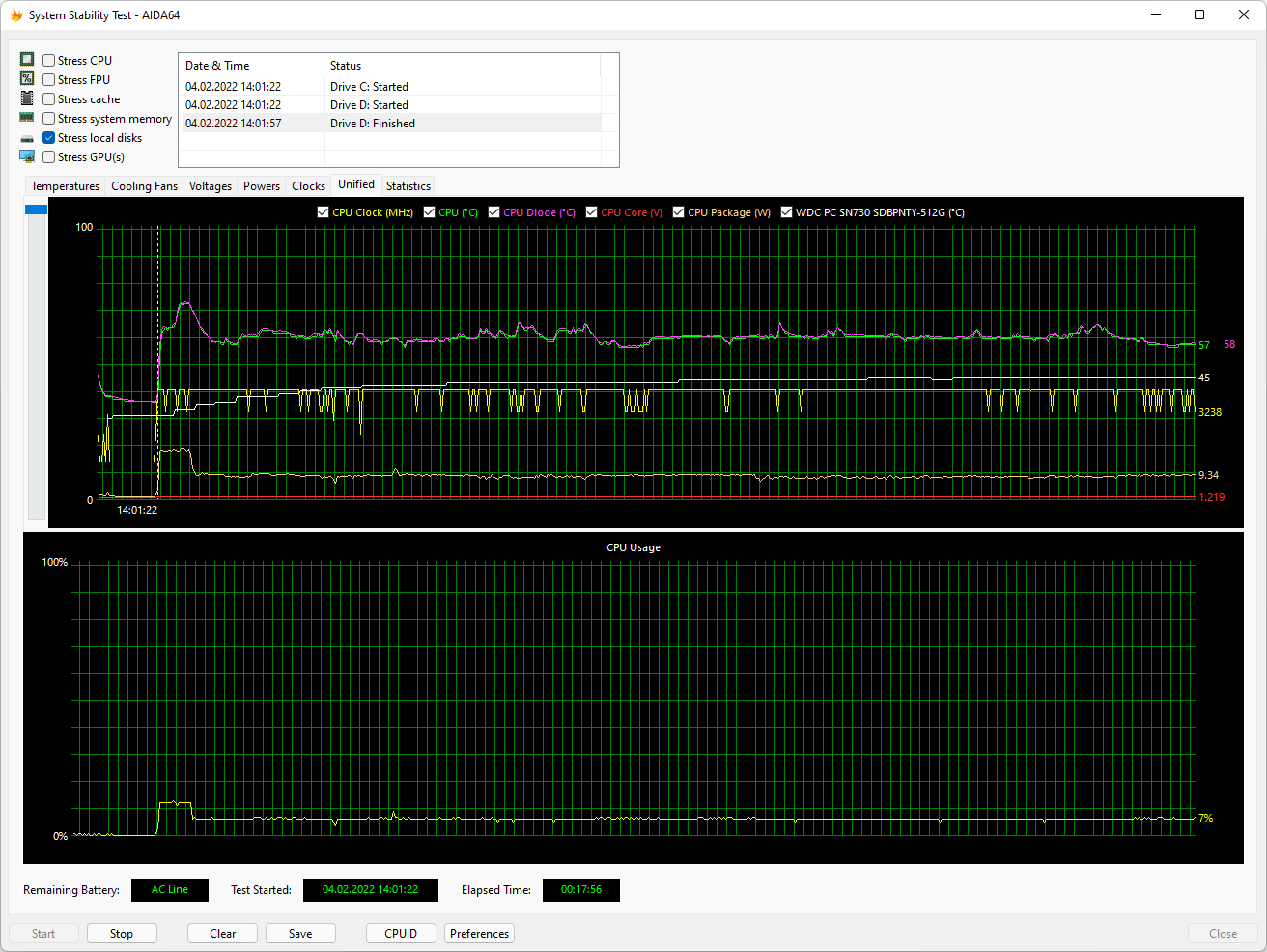 А вот и температурный режим работы SSD в стресс-тесте AIDA64 Extreme: