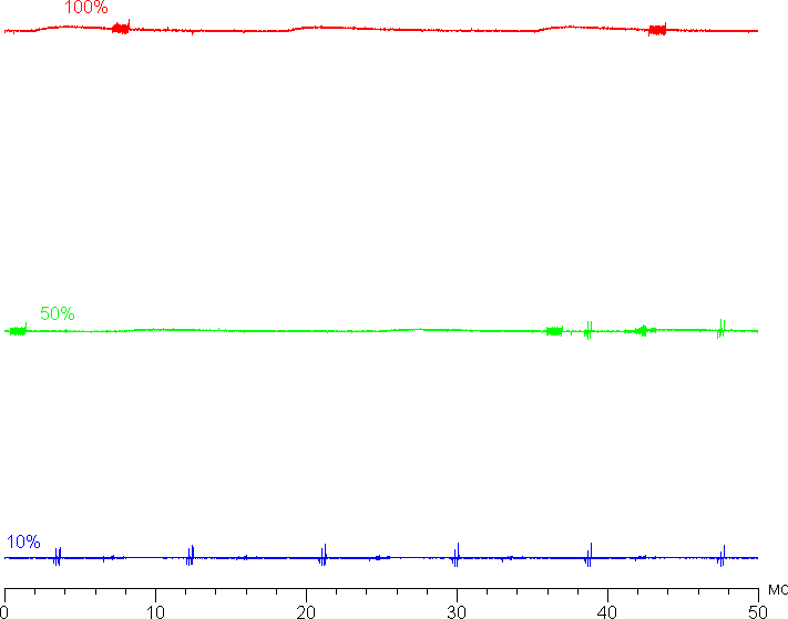 На любом уровне яркости значимая модуляция подсветки отсутствует, поэтому нет и никакого мерцания экрана. В доказательство приведем графики зависимости яркости (вертикальная ось) от времени (горизонтальная ось) при различных значениях настройки яркости: